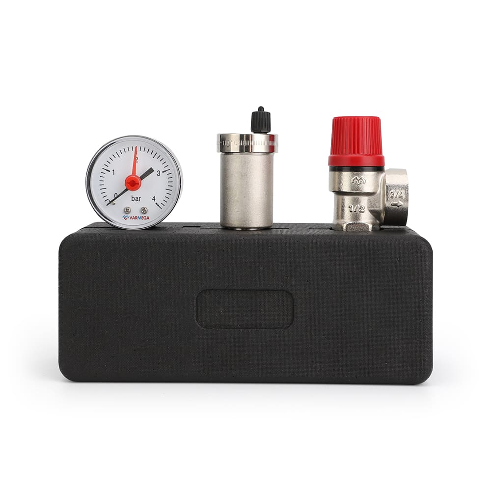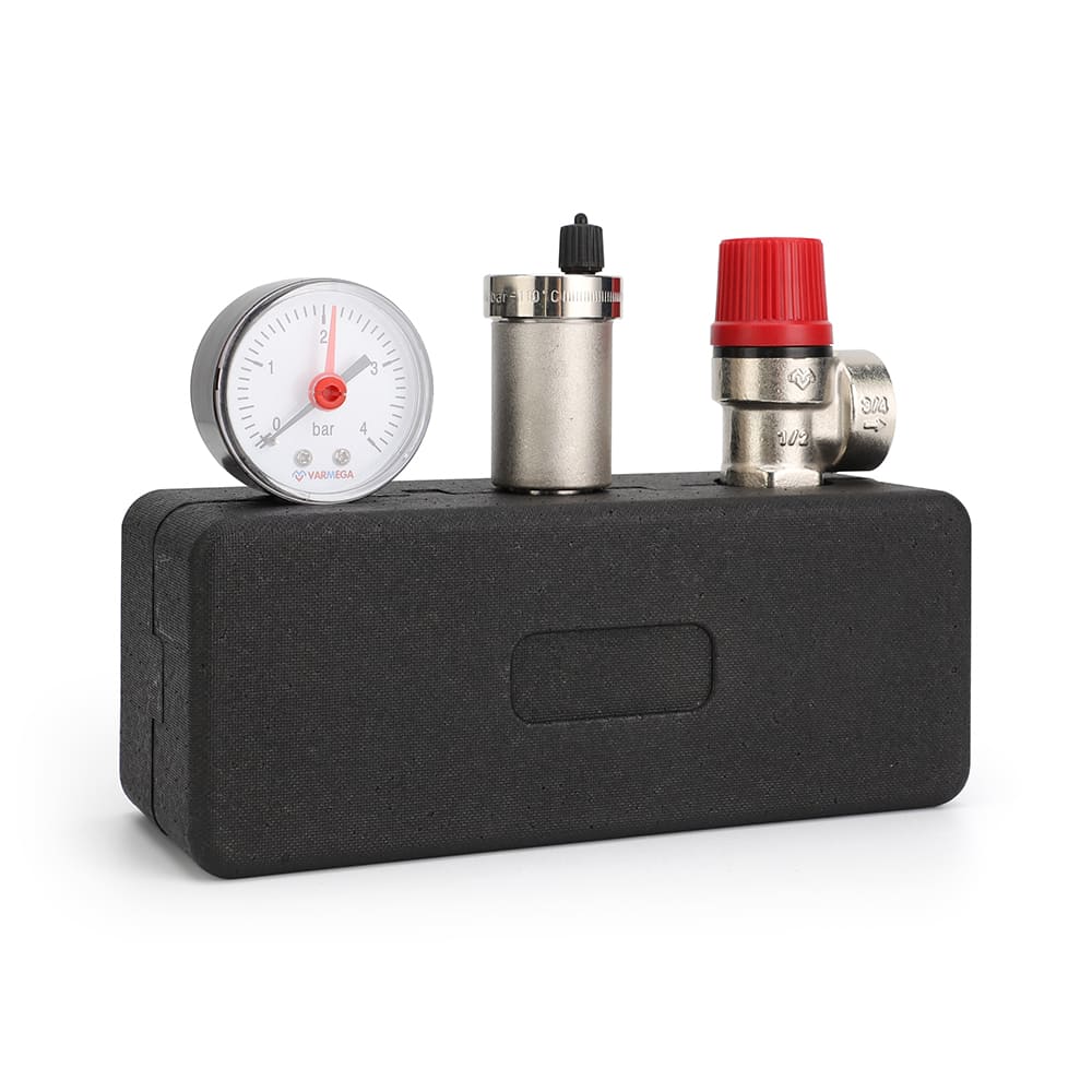 Группа безопасности котла Varmega применяется в закрытых системах водяного отопления для защиты от превышения максимально допустимого рабочего давления и отвода воздуха. Она состоит из предохранительного клапана, автоматического воздухоотводчика с запорным клапаном и манометра, смонтированных на общем основании – консоли из оцинкованной стали. Группу безопасности необходимо устанавливать строго вертикально в любой точке системы отопления выше котла, при этом, желательно, осуществлять установку в месте с минимально возможной температурой. На участке трубопровода от котла до группы безопасности запрещается установка запорной арматуры, фильтров и других элементов, которые могут уменьшить его проходное сечение.