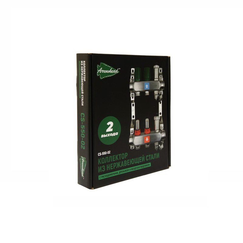 Коллектор из нержавеющей стали с расходомерами, дренажом и воздухоотводчиком ARROWHEAD, 2 выхода