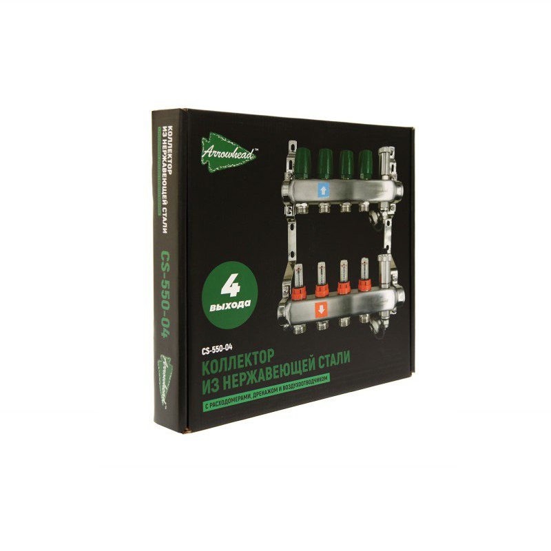 Коллектор из нержавеющей стали с расходомерами, дренажом и воздухоотводчиком ARROWHEAD, 4 выхода