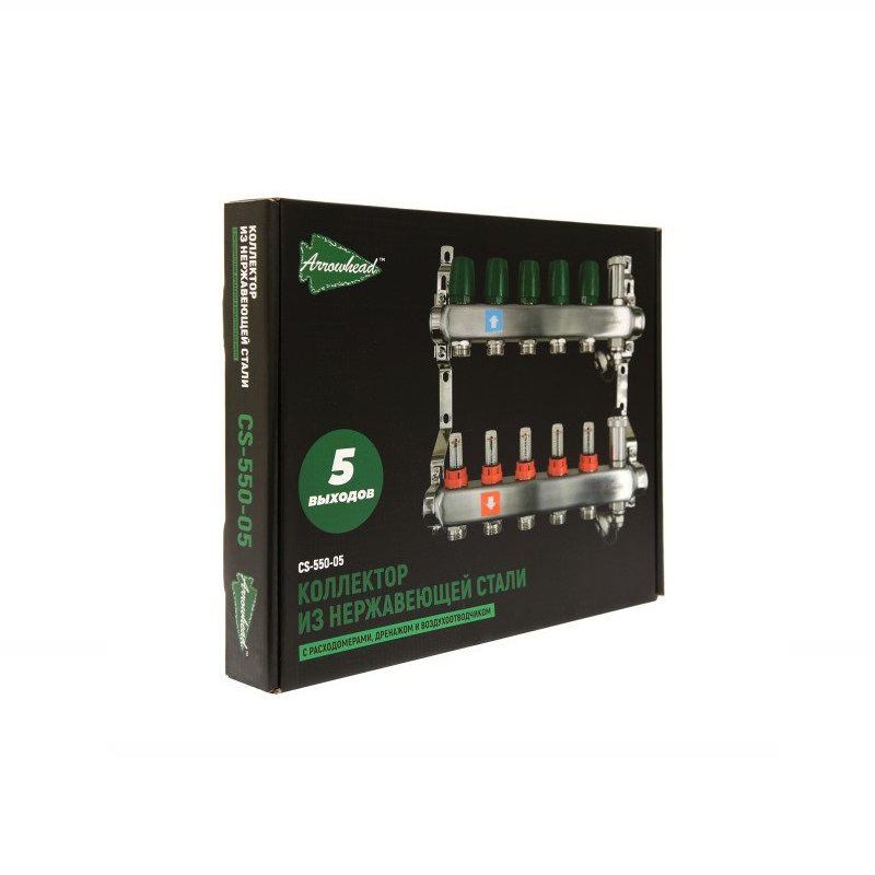 Коллектор из нержавеющей стали с расходомерами, дренажом и воздухоотводчиком ARROWHEAD, 5 выходов