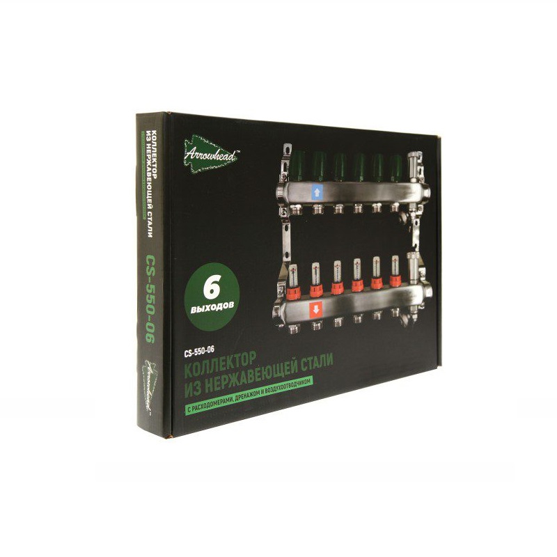 Коллектор из нержавеющей стали с расходомерами, дренажом и воздухоотводчиком ARROWHEAD, 6 выходов