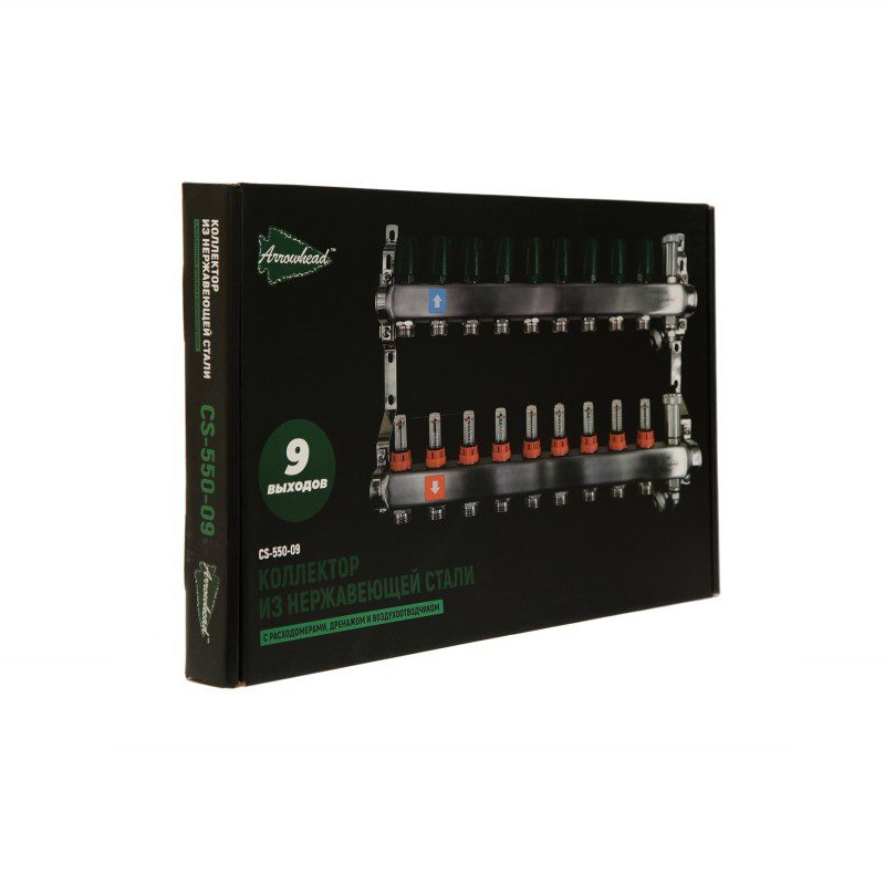 Коллектор из нержавеющей стали с расходомерами, дренажом и воздухоотводчиком ARROWHEAD, 9 выходов
