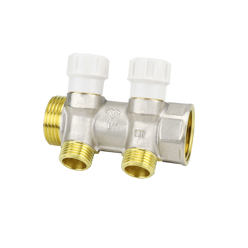Коллектор распределительный с запорными клапанами Varmega, 1″, на 2 выхода 1/2″ (VM14722)