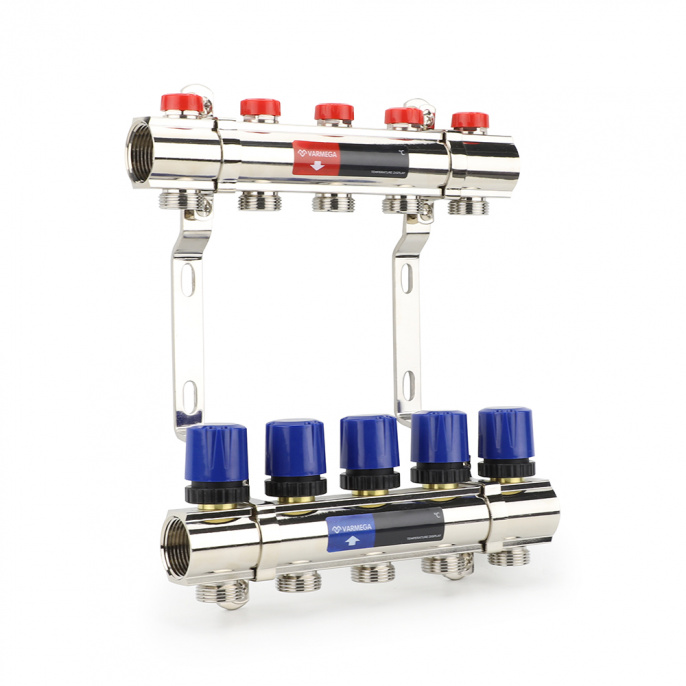 Коллекторная группа для отопления Varmega, ВР 1″, на 5 контуров 3/4″ EK, латунь (VM15805)