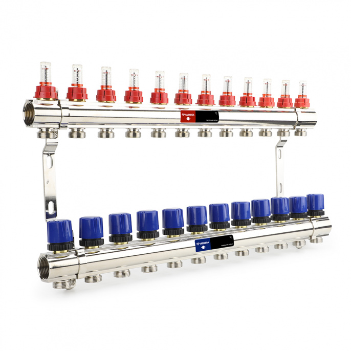 Коллекторная группа состоит из двух латунных коллекторов, смонтированных на кронштейнах. На каждом отводе подающего коллектора, установлены ручные балансировочные вентили или расходомеры (ротометры), комбинированные с балансировочными вентилями. Такая конструкция позволяет настроить (сбалансировать) контуры системы отопления. Использование коллекторных групп с расходомерами позволяет произвести настройку, ориентируясь на объективные данные. Расходомеры показывают расход от 0 до 5 л/мин.