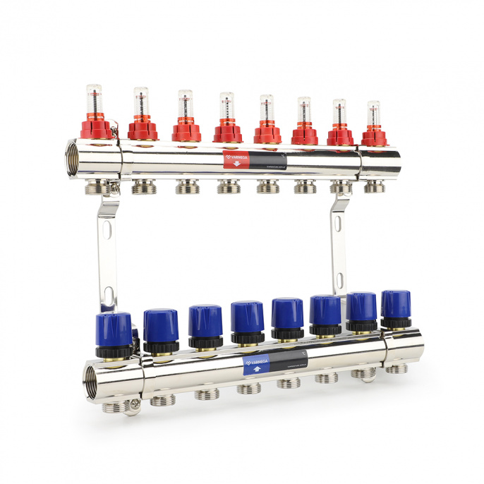 Коллекторная группа с расходомерами Varmega, ВР 1″, на 8 контуров 3/4″ EK, латунь (VM15408)