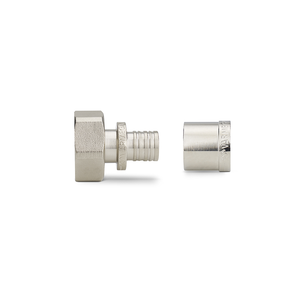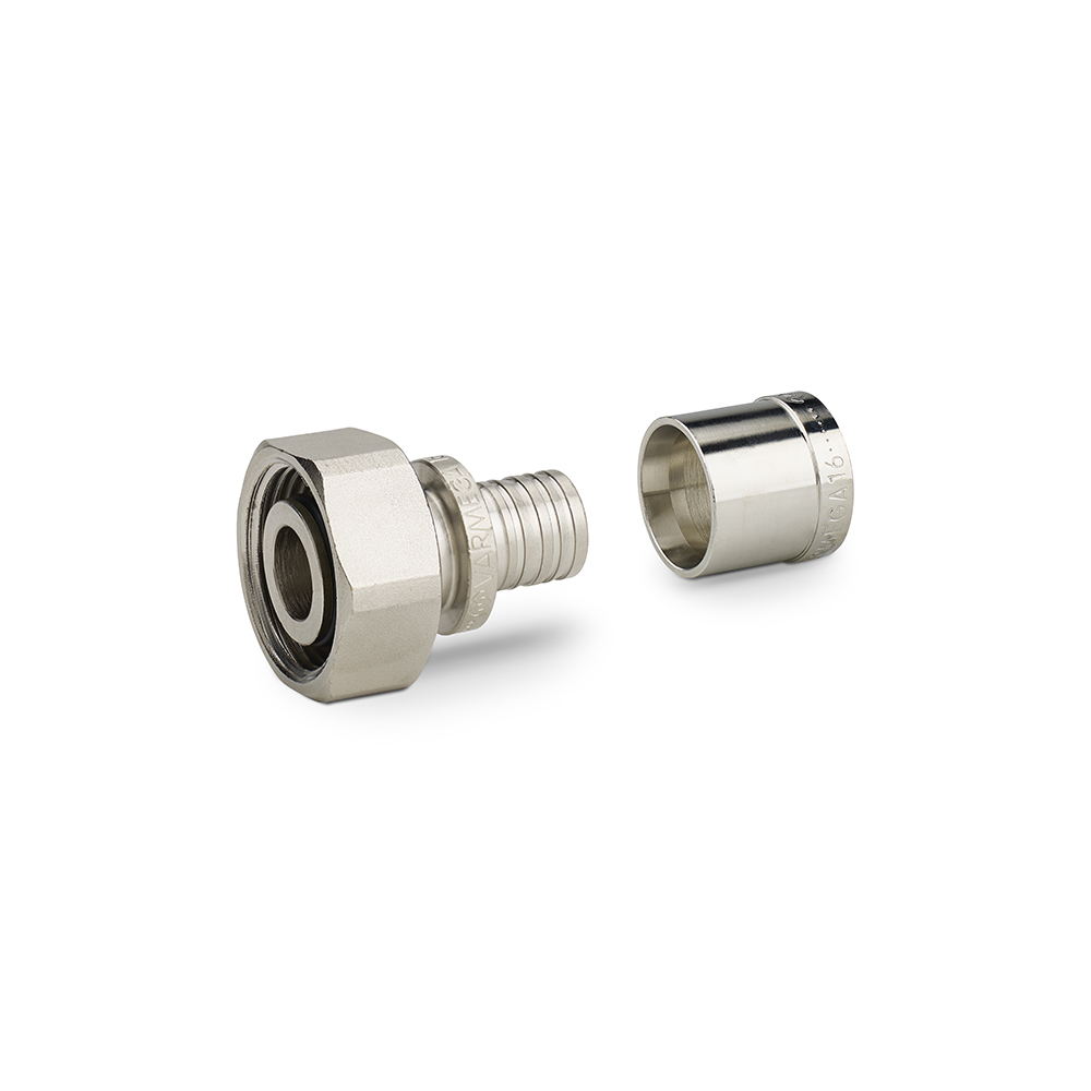 Муфта 3/4 ЕК с накидной гайкой Varmega VM51750 поставляется в комплекте с гильзой и используется с трубами PE-X размером 16×2.0 мм.