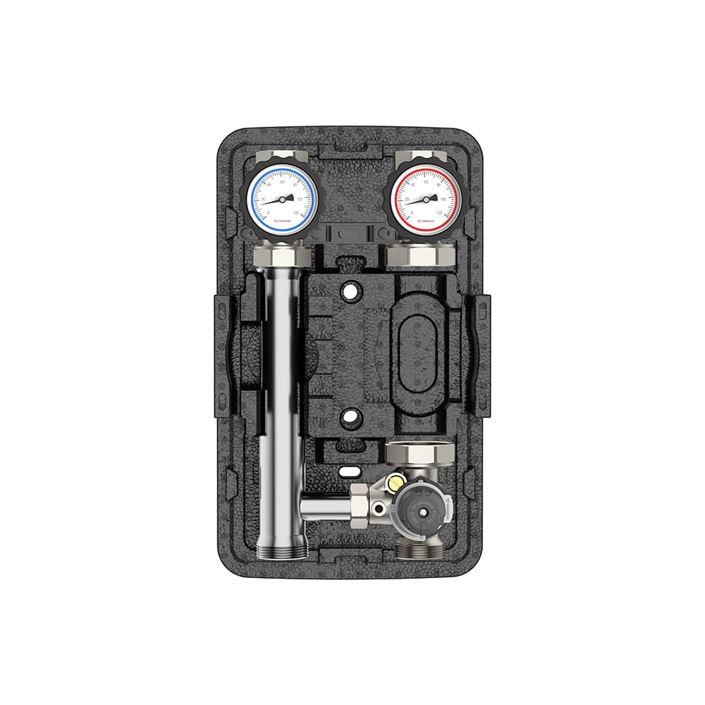 Насосные группы Varmega V-Flow серии VMPG12 идут в комплекте с трехходовым клапаном, но без сервопривода. Если необходимо осуществлять подмешивание воды в автоматическом режиме, то необходимо приобрести соответствующий привод, который, в свою очередь, подключается к автоматике управления.