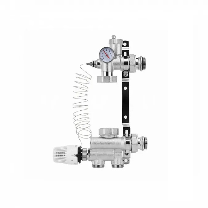 Насосно-смесительный узел Varmega Varmix-TH, с термоголовкой с выносным датчиком, без насоса предназначен для создания низкотемпературных систем отопления (типа «теплый пол»). Устанавливается непосредственно на коллекторной группе низкотемпературного контура и подключается к высокотемпературному контуру системы отопления. Комплектуется регулируемыми креплениями, автоматическим воздухоотводчиком, разъемными соединениями для подключения коллекторного блока, термометром, байпасной линией. Циркуляционный насос не входит в комплект поставки и покупается отдельно. Рекомендуемая монтажная длина насоса составляет 130 мм. В случаях использования коллекторных групп других производителей, при помощи регулируемого кронштейна длина может быть отрегулирована под насос с базой 180 мм.