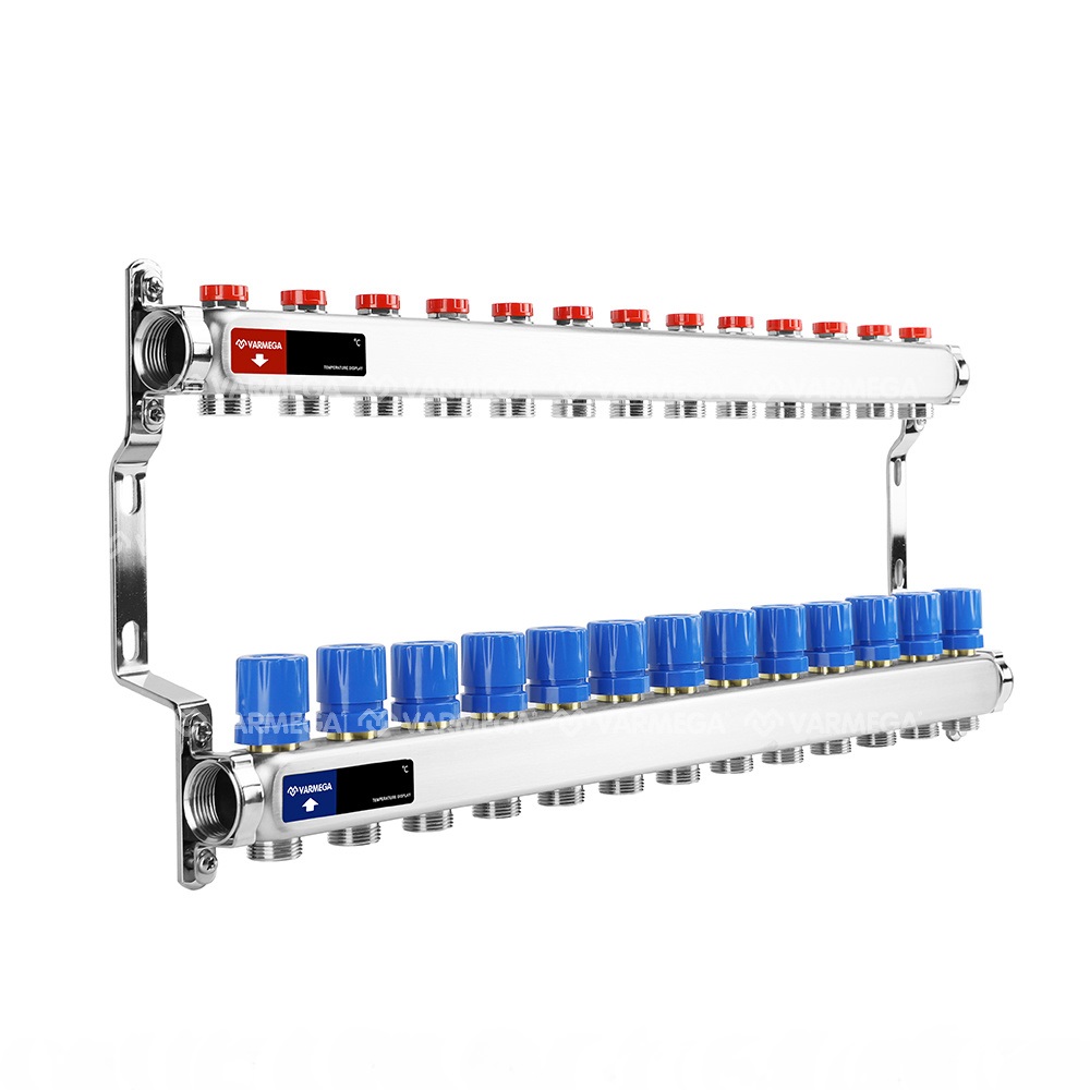 Распределительный коллектор для отопления Varmega, ВР 1″, на 13 контуров 3/4″ EK, нержавеющая сталь (VM15513)