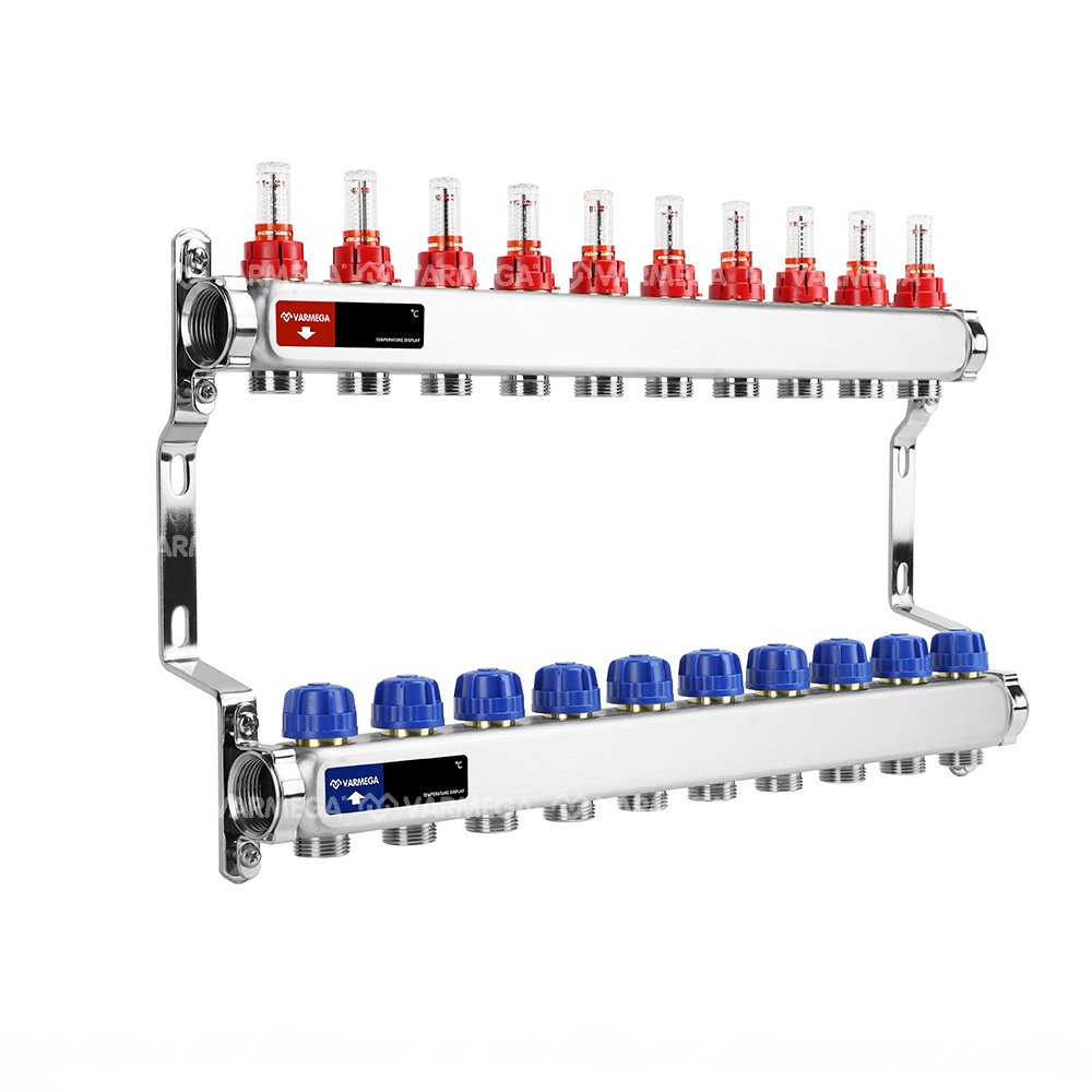 Распределительный коллектор с расходомерами Varmega, ВР 1″, на 10 контуров 3/4″ EK, нержавеющая сталь (VM15110)
