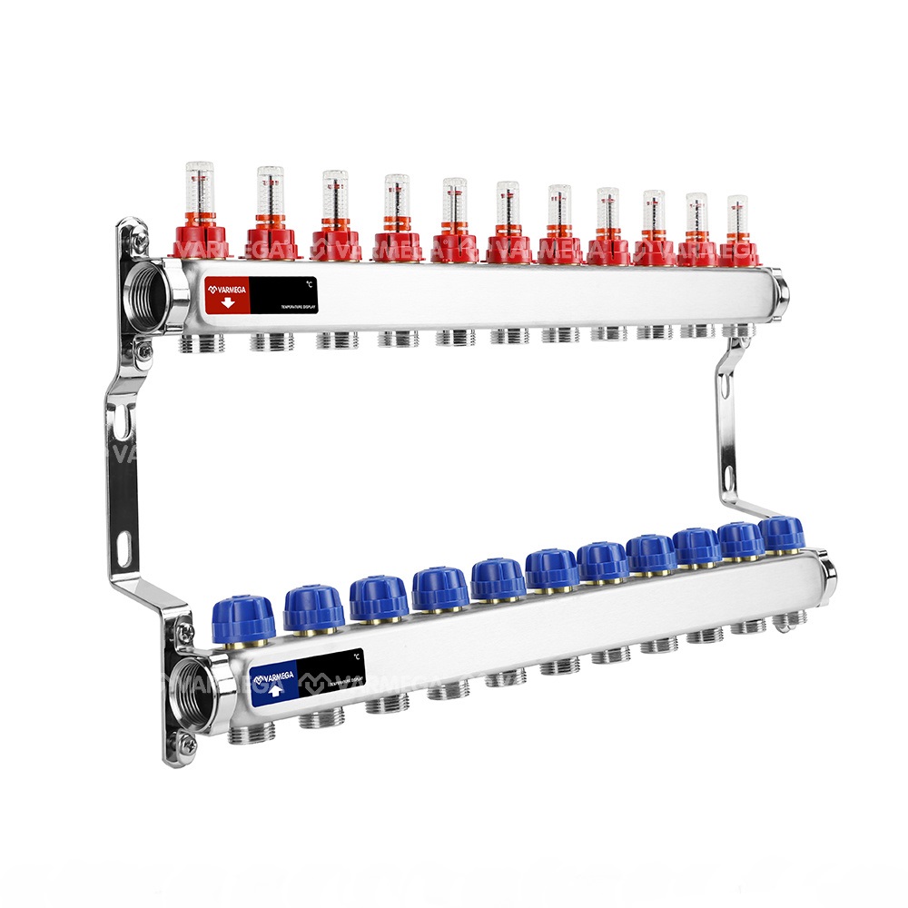 Распределительный коллектор с расходомерами Varmega, ВР 1″, на 11 контуров 3/4″ EK, нержавеющая сталь (VM15111)
