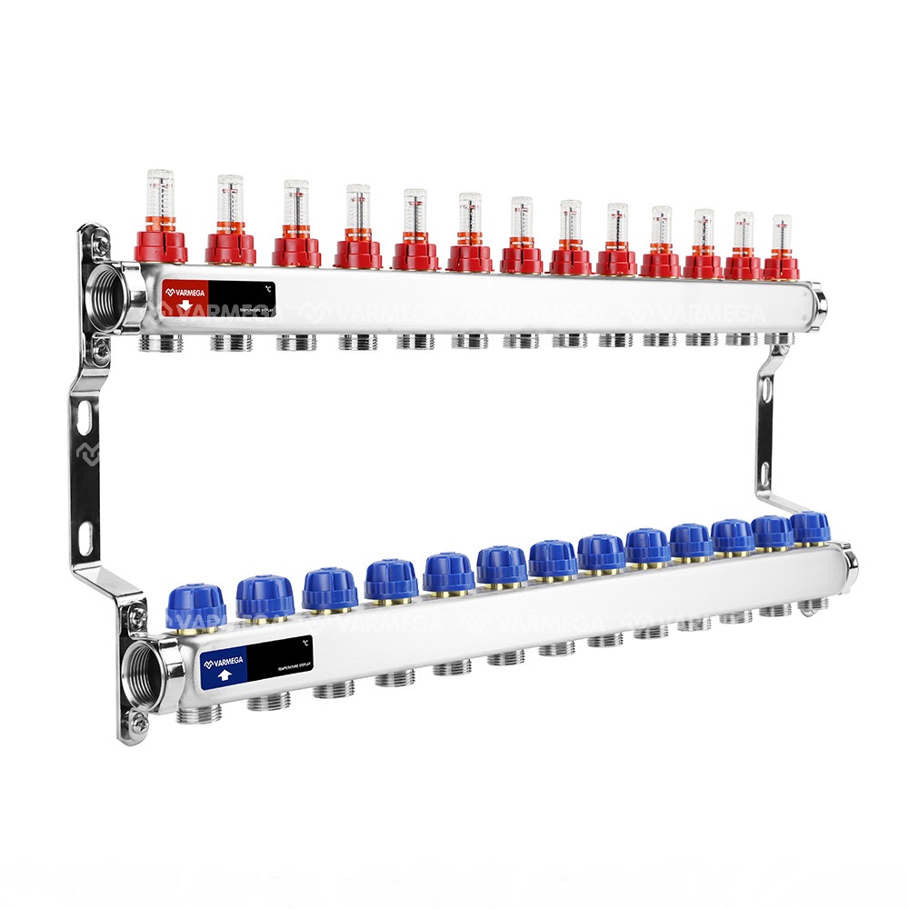 Распределительный коллектор с расходомерами Varmega, ВР 1″, на 13 контуров 3/4″ EK, нержавеющая сталь (VM15113)