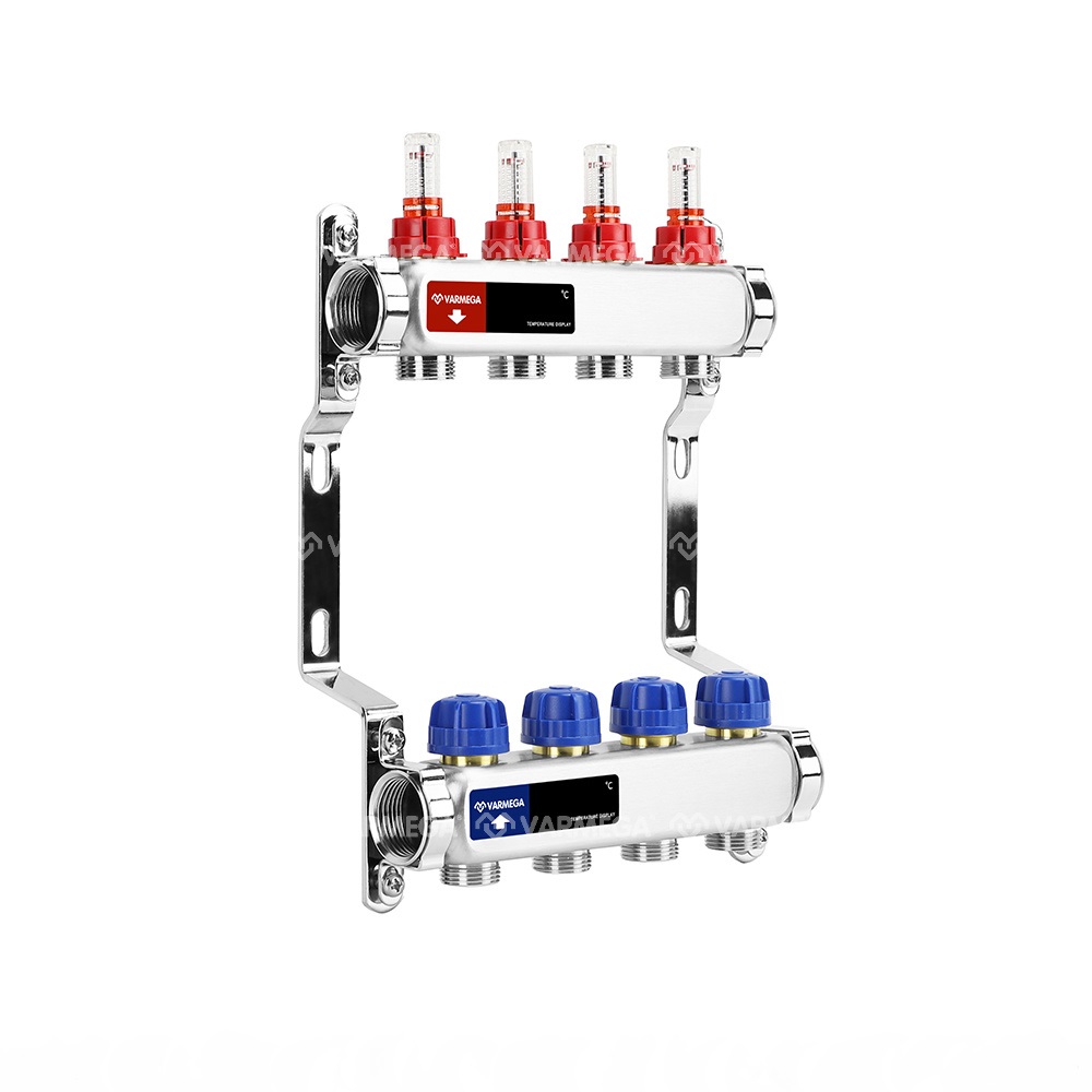Коллекторные группы предварительной сборки из нержавеющей стали с расходомерами марки Varmega предназначены для распределения и регулирования потоков теплоносителя в низкотемпературных системах отопления (напольное отопление). Оснащены расходомерами на подающем коллекторе и термостатическими вентилями с размером M30x1,5 (с возможностью установки термоэлектрических приводов) на обратном коллекторе. Каждый коллектор подвергается в заводских условиях проверке на функционирование и герметичность уплотнений.