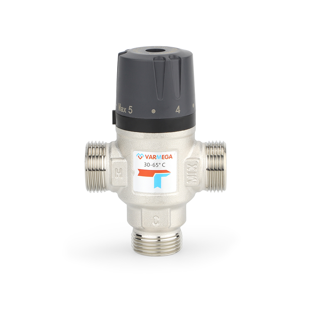 Термостатический смесительный клапан Varmega, НР 1″, Kvs 1.6, PN 10, смешение в бок, 30-65°С (VM17203)